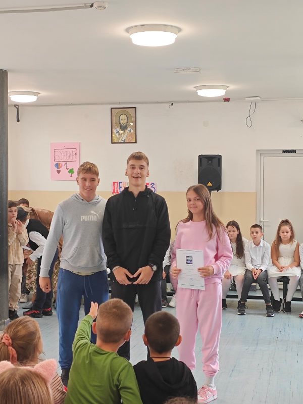 Током приредбе, првацима су уручени беџеви као симболи припадности нашој школи, али и слаткиши који су додатно улепшали овај значајан дан. Посебан тренутак био је свечани пријем првака у Дечији савез, чиме су званично постали део велике породице ученика.
